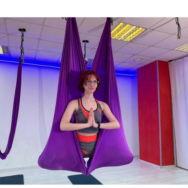 Йога в подвешенном состоянии, способствующая глубокому расслаблению и растяжке.