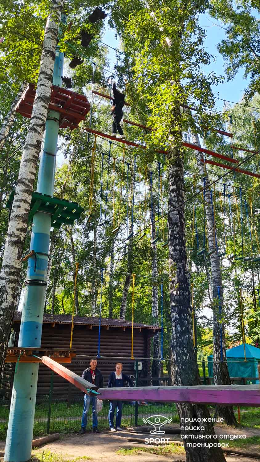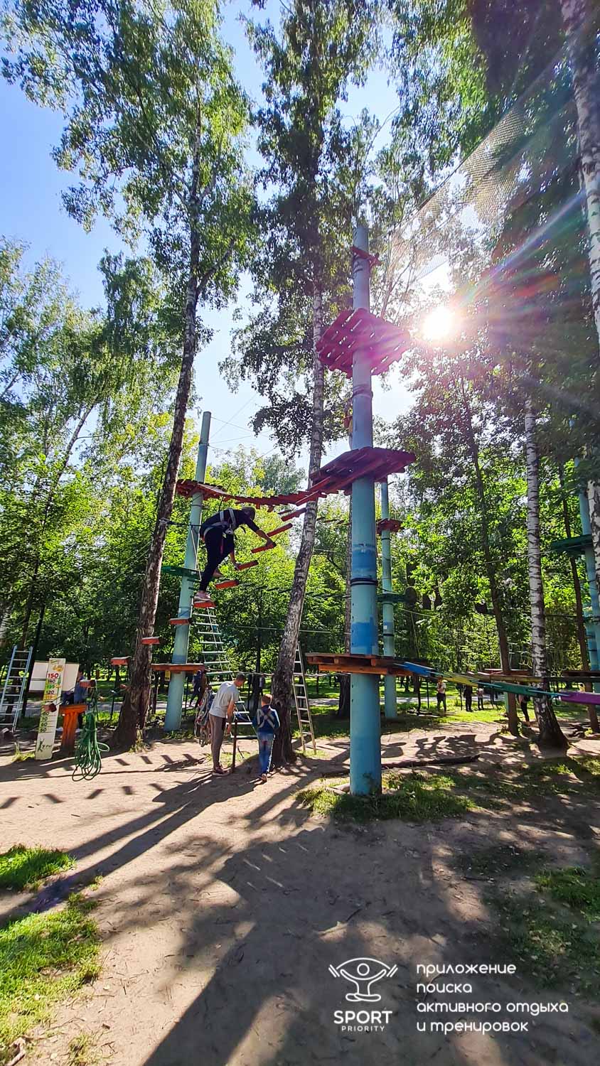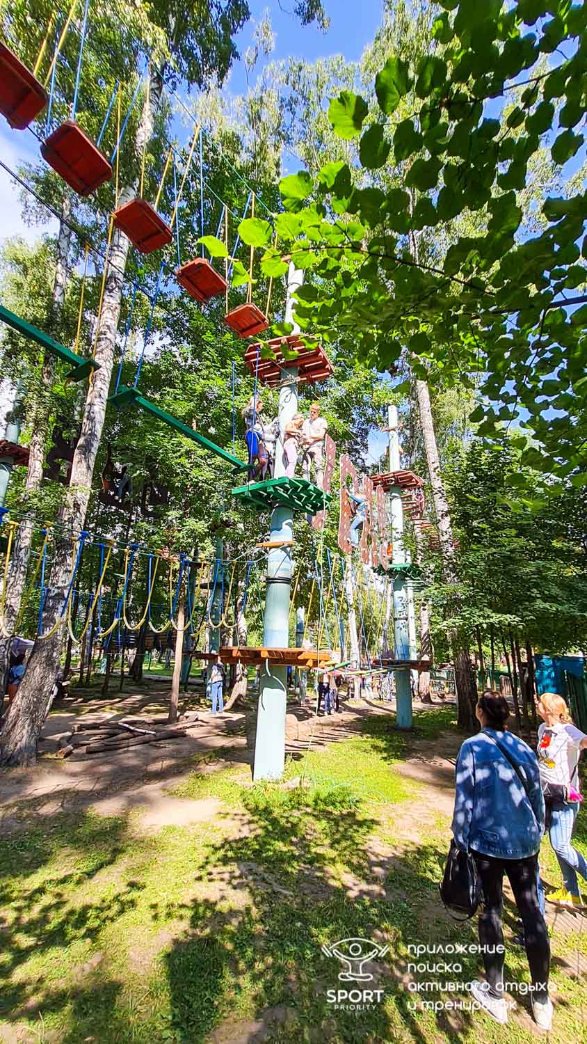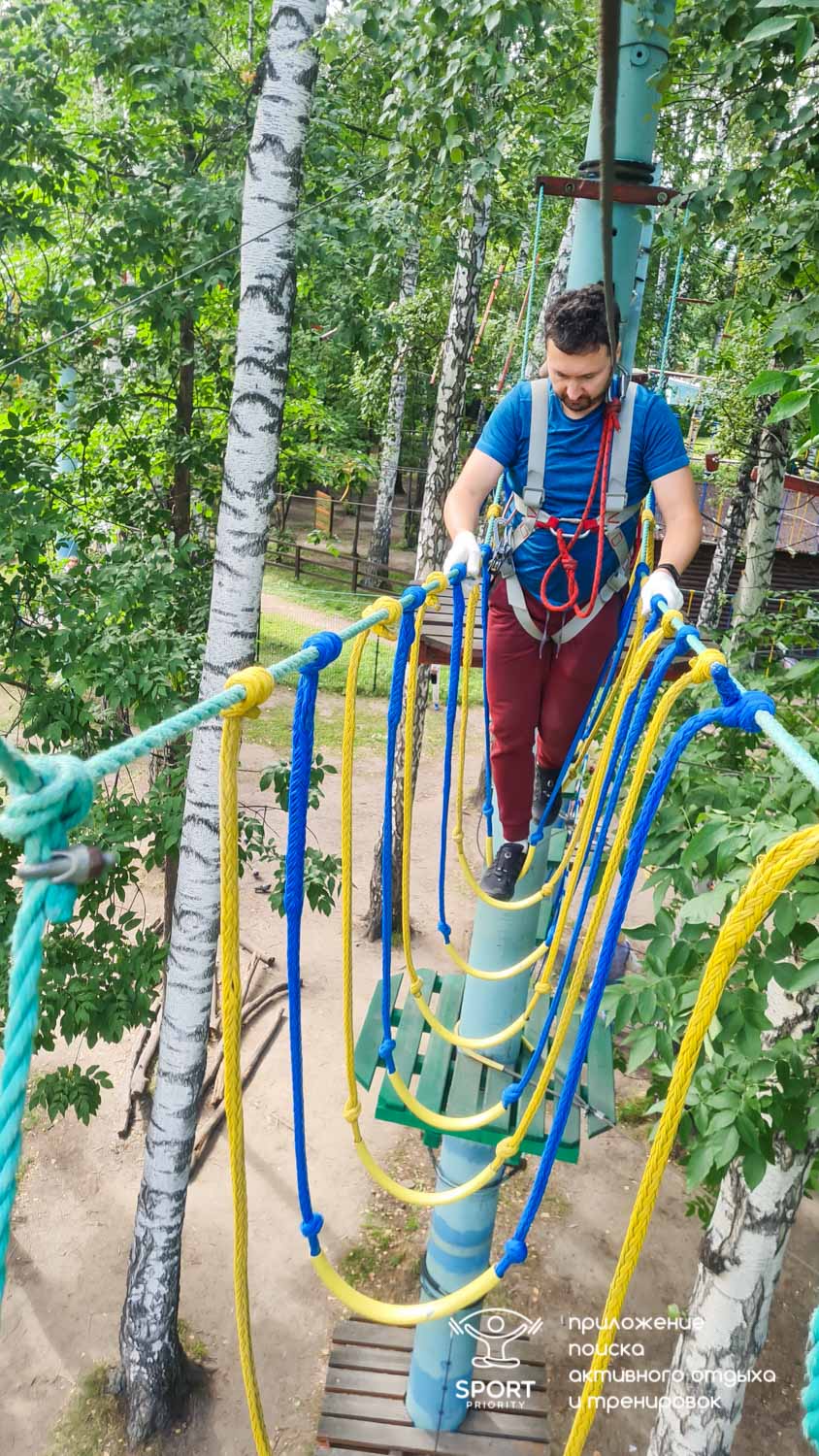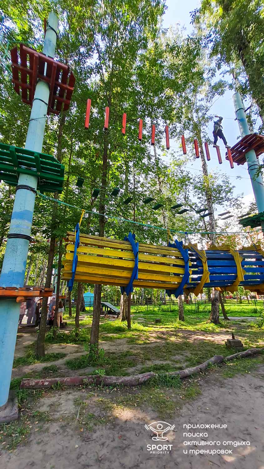 Этапы парка высотой от 2-х до 8 метров представляют собой разнообразные переправы от площадки к площадке: «тарзанки», верёвочные и деревянные мостики, лестницы, сети и многое другое.