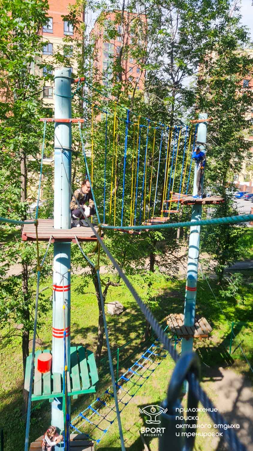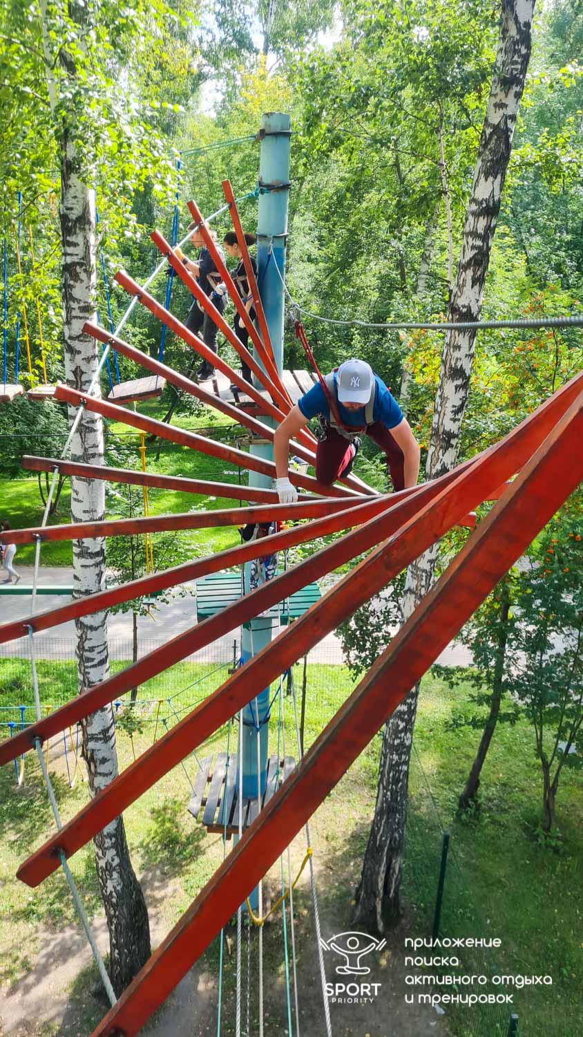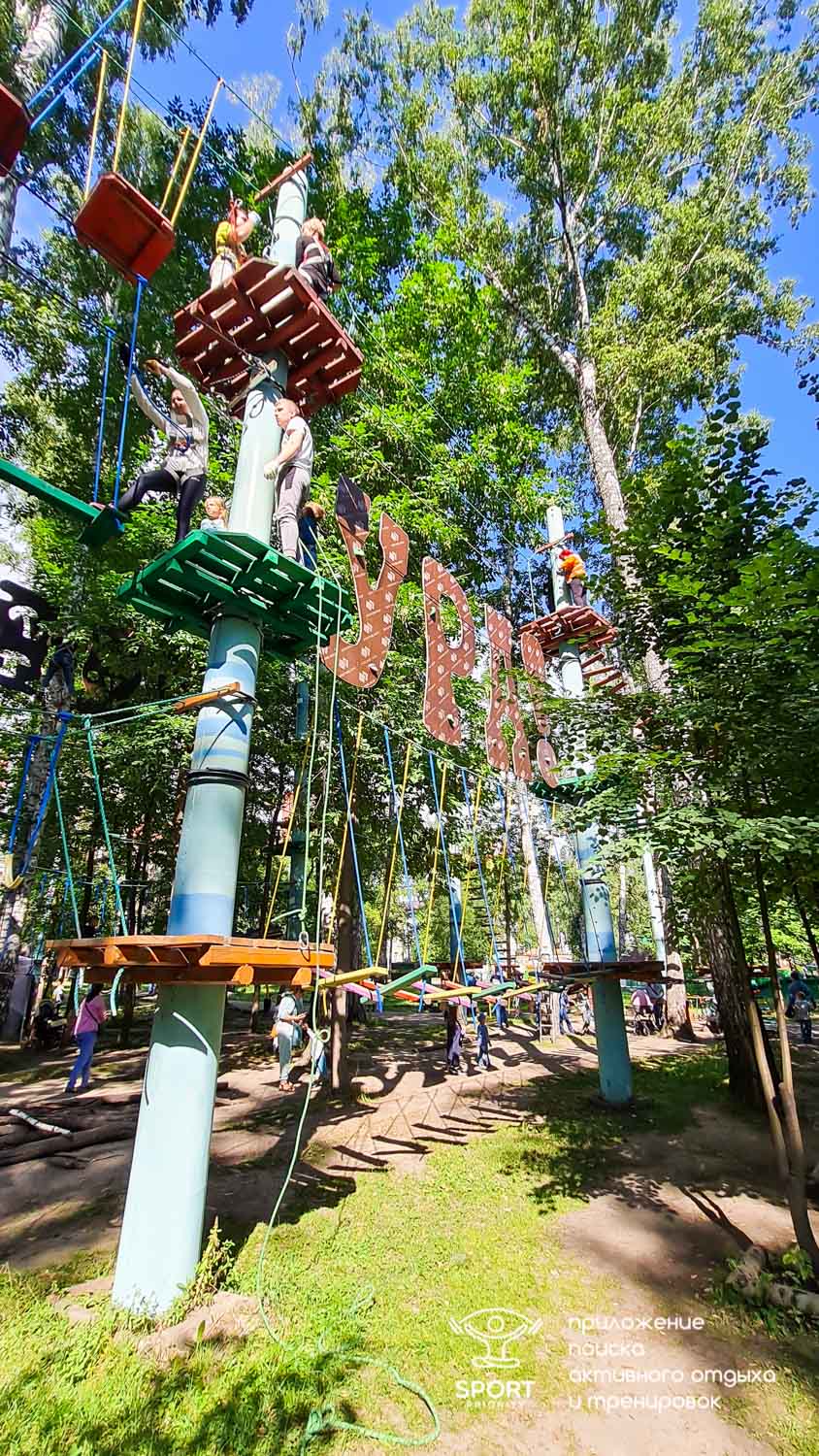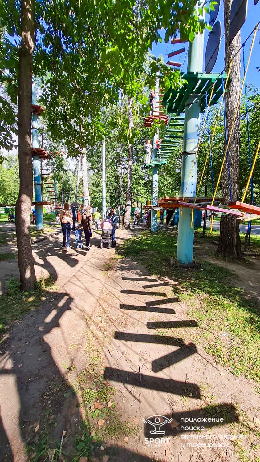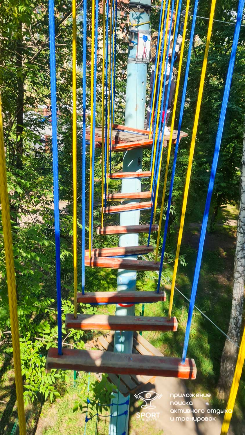 Этапы парка высотой от 2-х до 8 метров представляют собой разнообразные переправы от площадки к площадке: «тарзанки», верёвочные и деревянные мостики, лестницы, сети и многое другое.